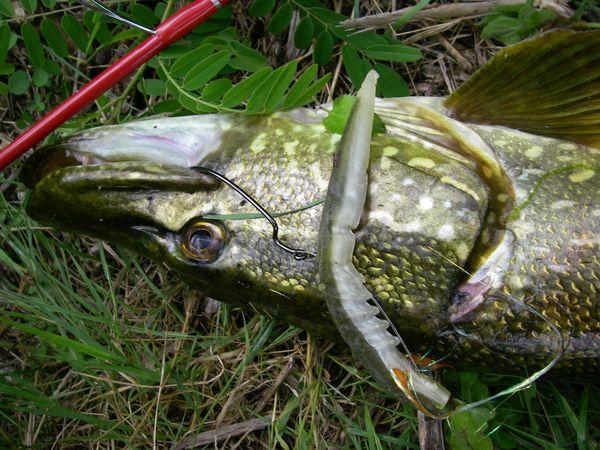 Brochet pris sur un x-lay de 15cm dont je lui ai aggrandi les bavettes, ventre blanc nacrée + dos chartreux/watermelon. Hameçon texan 7/0. |